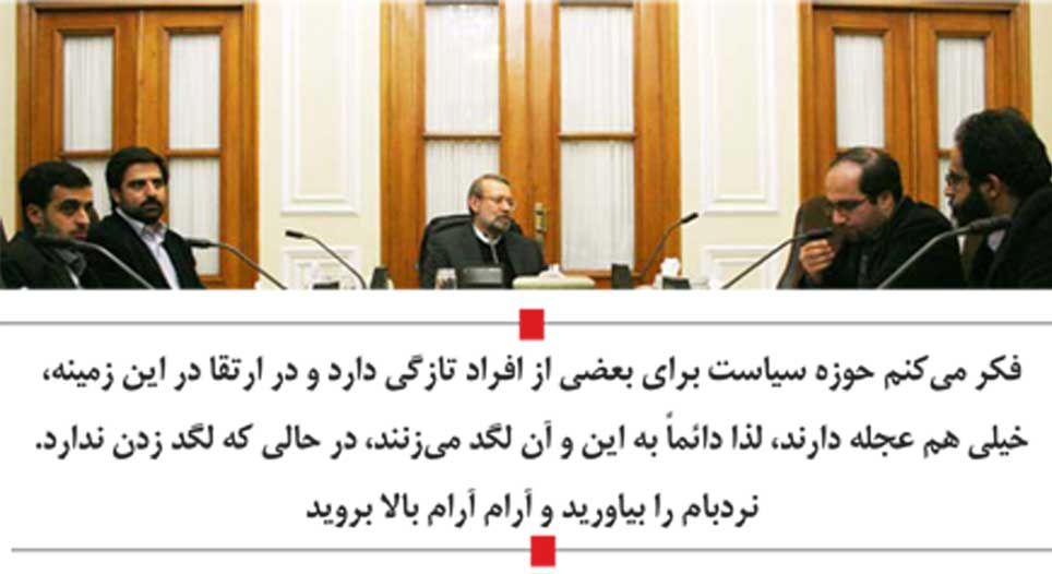 دکتر لاریجانی توصیههایی هم به آنها که به اعتقاد وی تازه به سیاست رسیدهاند، داشت: در ارتقاء در این زمینه خیلی هم عجله دارند، لذا دائماً به این و آن لگد میزنند، در حالی که لگد زدن ندارد. نردبام را بیاورید و آرام آرام بالا بروید.
