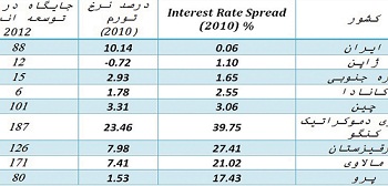 همان طور که در جدول قابل مشاهده میباشد، کشورهایی که (Spread) نرخ سود بانکی (بهره) کمتری دارند، به لحاظ تورمی و رتبهی شاخص توسعهی انسانی در وضعیت بهتری قرار دارند. به صورت معکوس، کشورهای با نرخ (Spread) بهرهی بیشتر، وضعیت بدتری را در شاخصهای گفته شده دارند. اگرچه نرخ (Spread) بهرهی بانکی برای ایران نرخی پایین میباشد، اما این نرخ عواقبی چون جریانهای اخیر بازارهای سکه و ارز را در پی داشته که نه تنها نتوانسته است هزینهی سرمایهگذاری را پایین آورد، بلکه ریسک آن را بالا برده است.