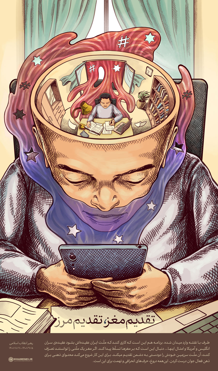 امام خامنهای: «طرف با نقشه وارد میدان شده. برنامه هم این است که کاری کنند که ملّت ایران عقیدهاش بشود عقیدهی سران انگلیس و آمریکا و امثال اینها... دنبال این است که بر مغزها تسلّط پیدا کند. اگر مغز یک ملّتی را توانستند تصرّف کنند، آن ملّت سرزمین خودش را دودستی به دشمن تقدیم میکند. برای این کار شروع میکند محتوای ذهنی برای ذهن فعال جوان درست کردن. اینهمه دروغ، حرفهای انحرافی و تهمت برای این است.» ۱۴۰۱/۸/۱۱ و ۱۴۰۱/۹/۵