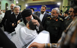 جمعی از جانبازان قطع نخاع و جانبازان بالای هفتاد درصد که همزمان چشمان و یک یا دو عضو بدن خود را از دست داده اند و همچنین خانواده های آنان، از نزدیک دیدار و در فضایی صمیمی آنان را مورد تفقد قرار دادند.حضرت آیت الله خامنه ای بعد از دیدار با جانبازان و خانواده های آنان در سخنان کوتاهی با اشاره به رنج ها و مشکلات جسمی جانبازان، اجر آنان را به دلیل این امتحان سخت، مضاعف و رو به افزایش دانستند و خاطرنشان کردند: جانبازان تابلو و تصویری از دوران ابتلاء بزرگ ملت ایران در دوران دفاع مقدس هستند و حضور آنان در جامعه، در واقع بیان حقایقی تاریخی، معرفتی، سیاسی و بین المللی است.