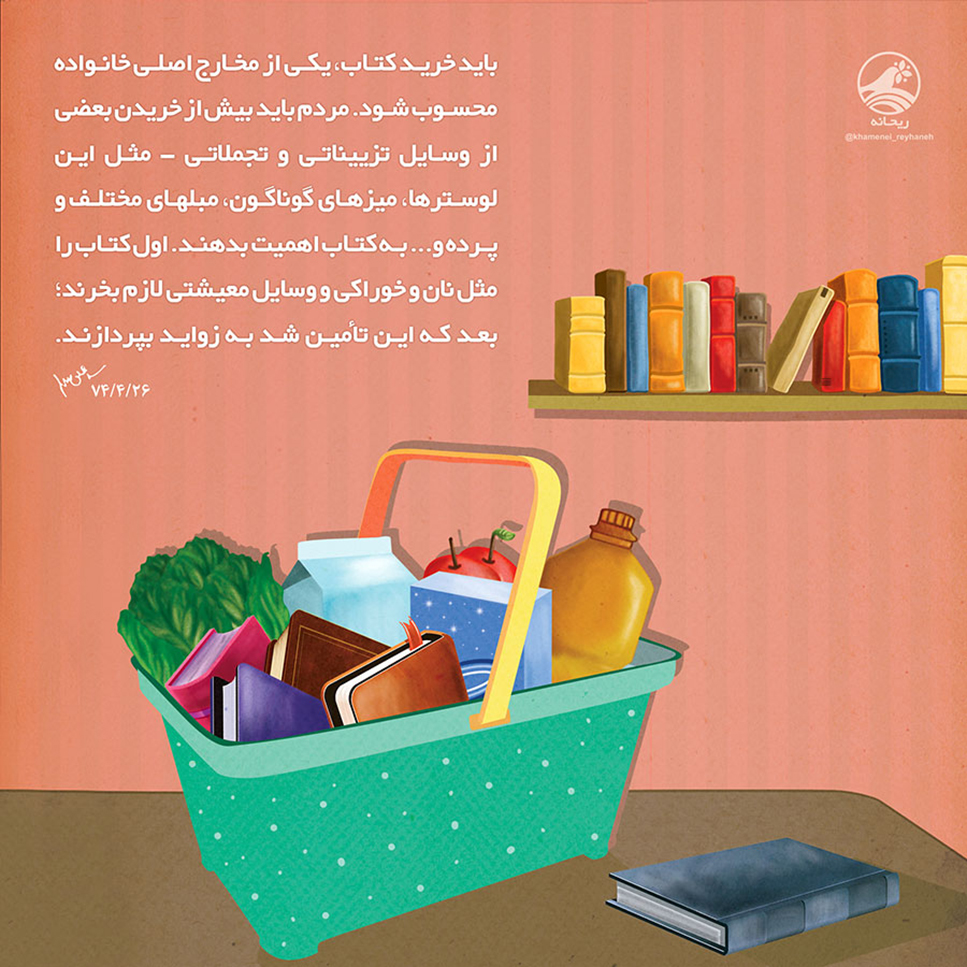 رهبر انقلاب: باید خرید کتاب، یکی از مخارج اصلی خانواده محسوب شود. مردم باید بیش از خریدن بعضی از وسایل تزییناتی و تجملاتی - مثل این لوسترها، میزهای گوناگون، مبلهای مختلف و پرده و... به کتاب اهمیت بدهند. اول کتاب را مثل نان و خوراکی و وسایل معیشتی لازم بخرند؛ بعد که این تأمین شد به زواید بپردازند.