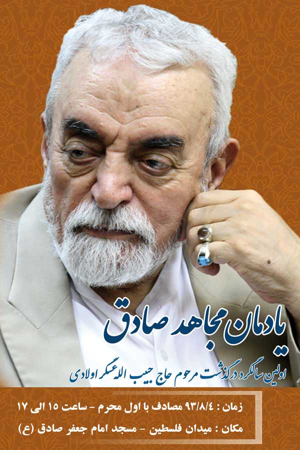 در اولین سالگرد ارتحال آن ابر مرد تاریخ انقلاب که همواره تا آخرین لحظه حیات جز در راه ولایت نبود برای ادای وظیفه و باز گویی و قدردانی خدمات او در مجلسی که به این مناسبت در روز یکشنبه چهارم آبان ماه مصادف با اول محرم از ساعت 15 تا 17 بعد از ظهر در مسجد امام صادق (ع) واقع در میدان فلسطین برگزار می گردد، گرد هم می آئیم.