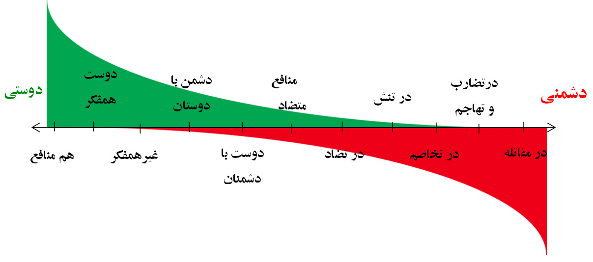 که باید با هر یک از آنها بر اساس منافع، از مناسبات، مراودات، مذاکرات، مصالحه، مبارزات، تهاجمات تا مقاتله / تدافعات داشت