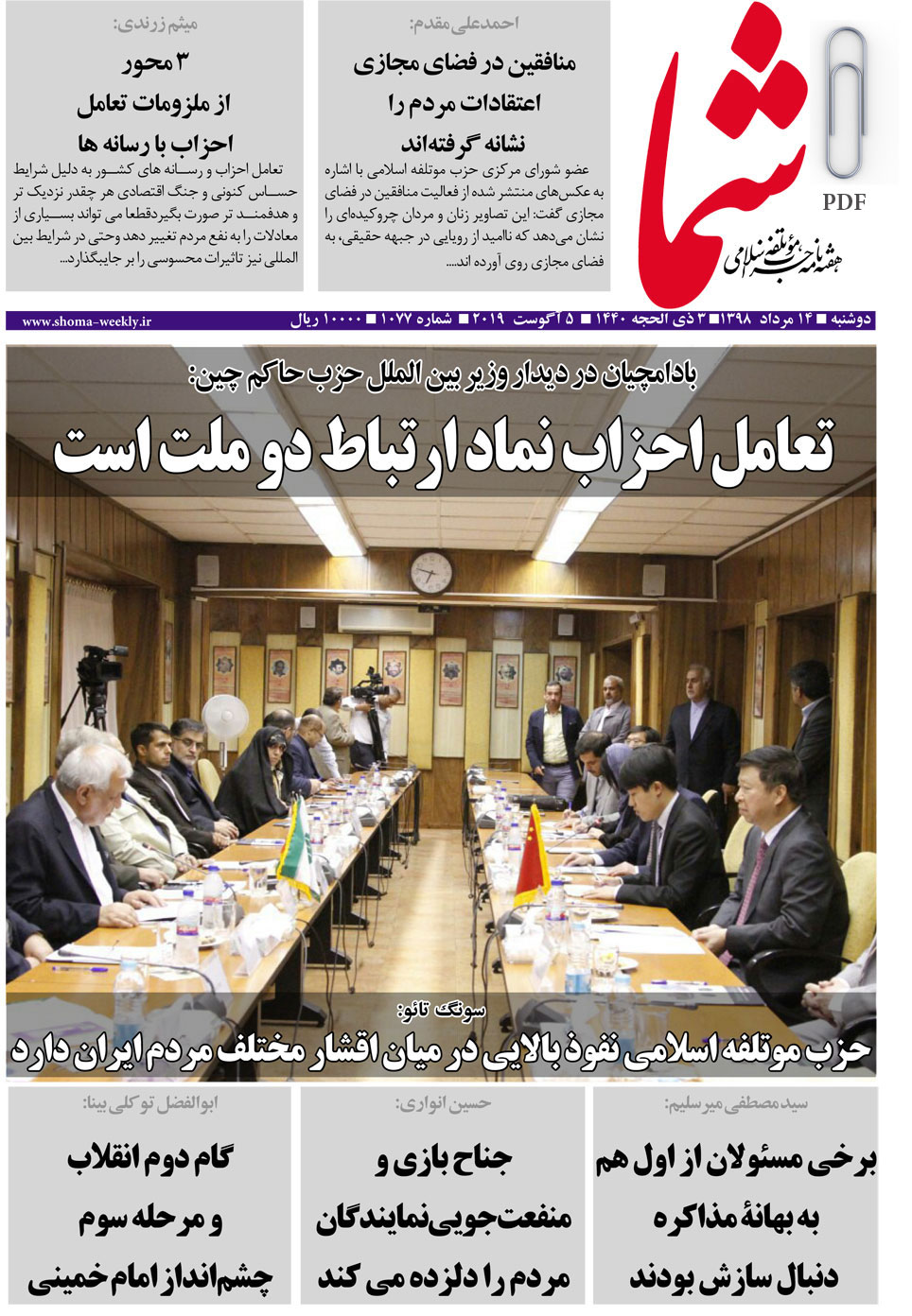 هفته نامه شما در تاریخ 14مرداد ماه 1398 به شماره 1077منتشر گردید. برای دریافت فایل PDF آن اینجا