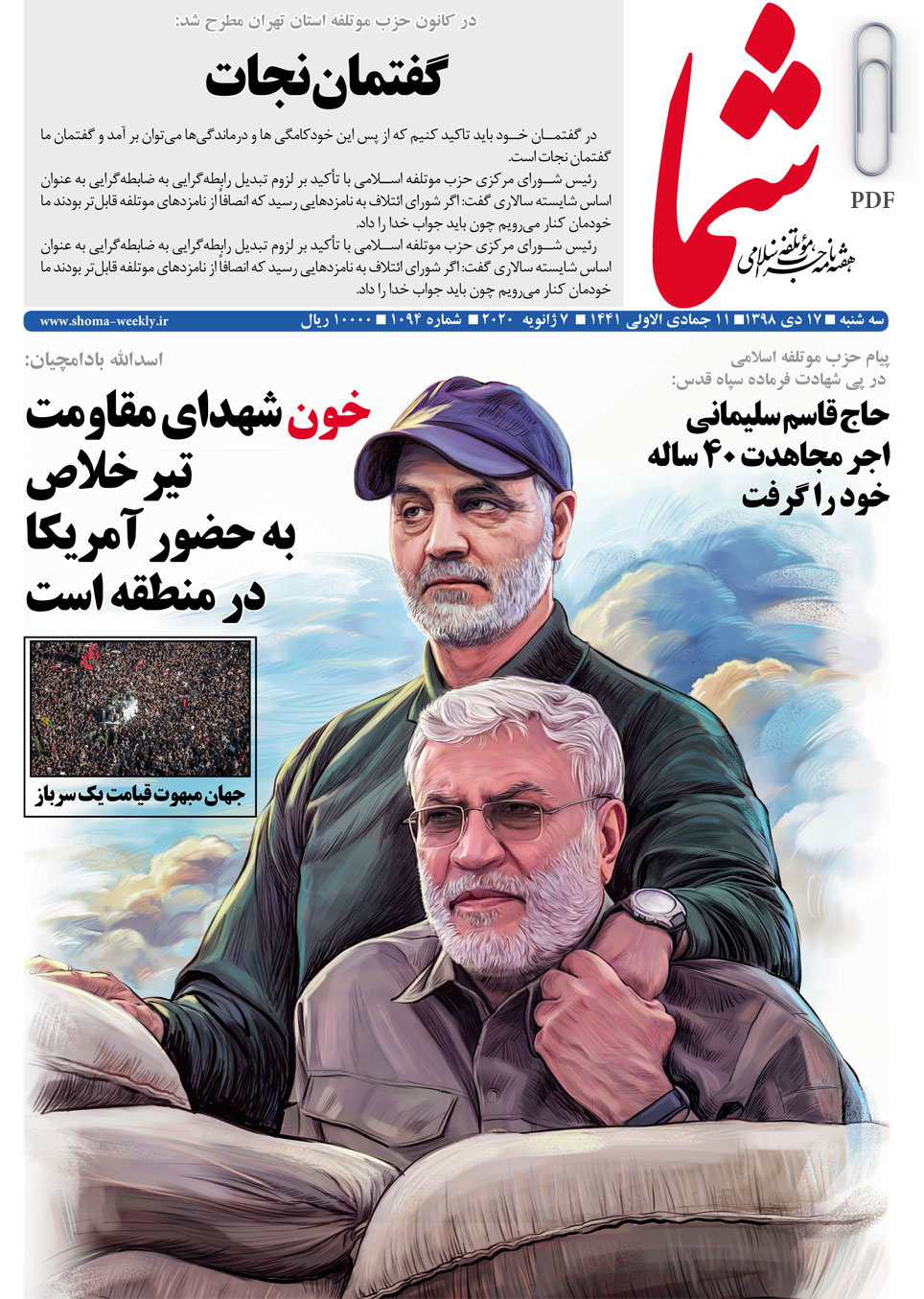 هفته نامه شما در تاریخ 17 دی ماه 1398 به شماره 1094منتشر گردید. برای دریافت فایل PDF آن اینجا