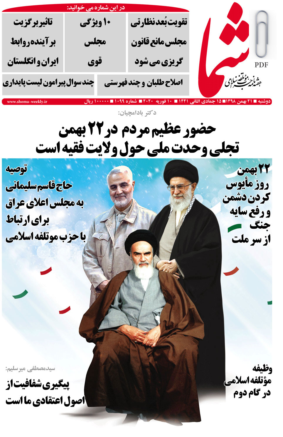 هفته نامه شما در تاریخ 21 بهمن ماه 1398 به شماره 1099 منتشر گردید. برای دریافت فایل PDF آن اینجا