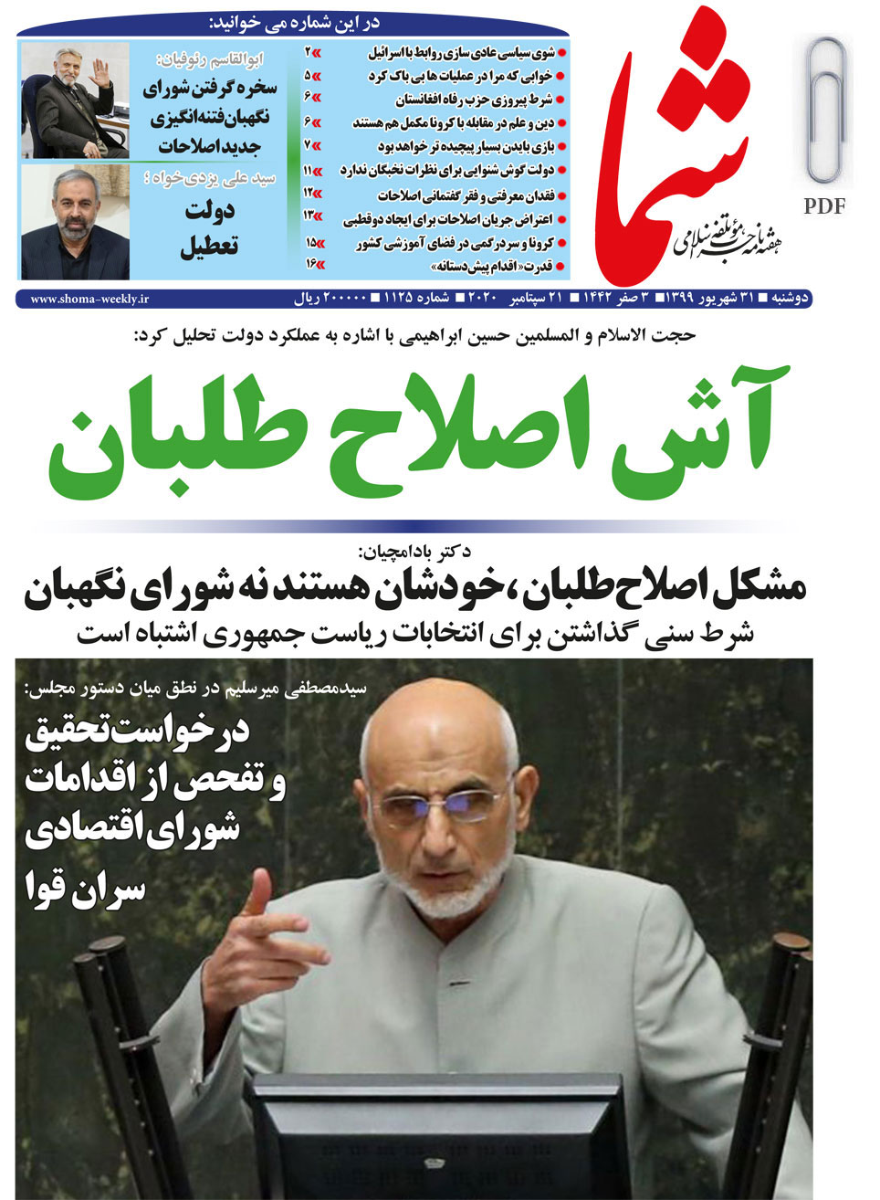 هفته نامه شما در تاریخ 31 شهریور ماه 1399 به شماره 1125منتشر گردید. برای دریافت فایل PDF آن اینجا