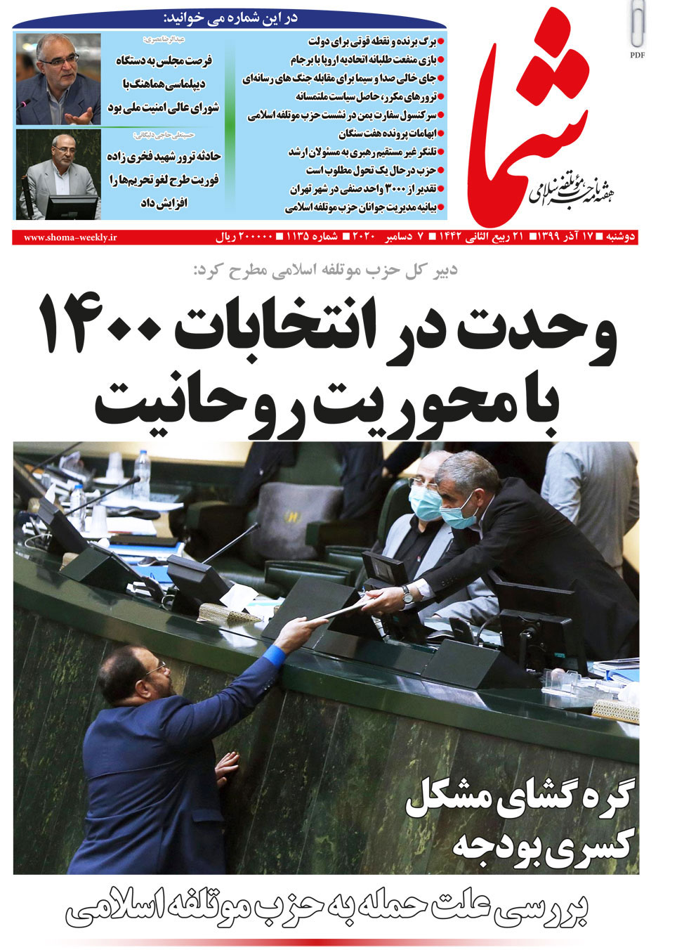 هفته نامه شما در تاریخ 17 آذر ماه 1399 به شماره 1135منتشر گردید. برای دریافت فایل PDF آن اینجا
