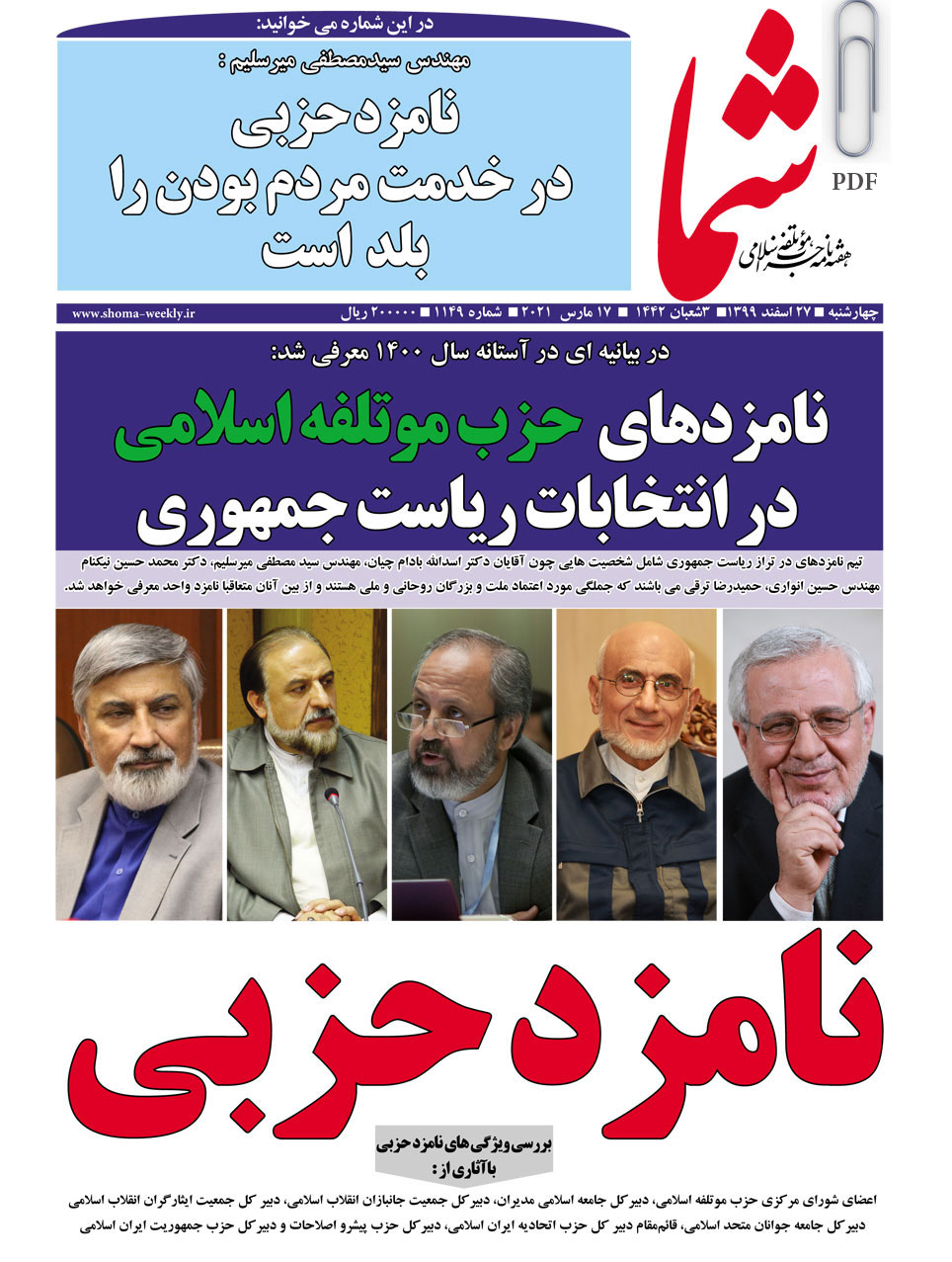 هفته نامه شما در تاریخ 27 اسفندماه 1399 به شماره 1149منتشر گردید. برای دریافت فایل PDF آن اینجا
