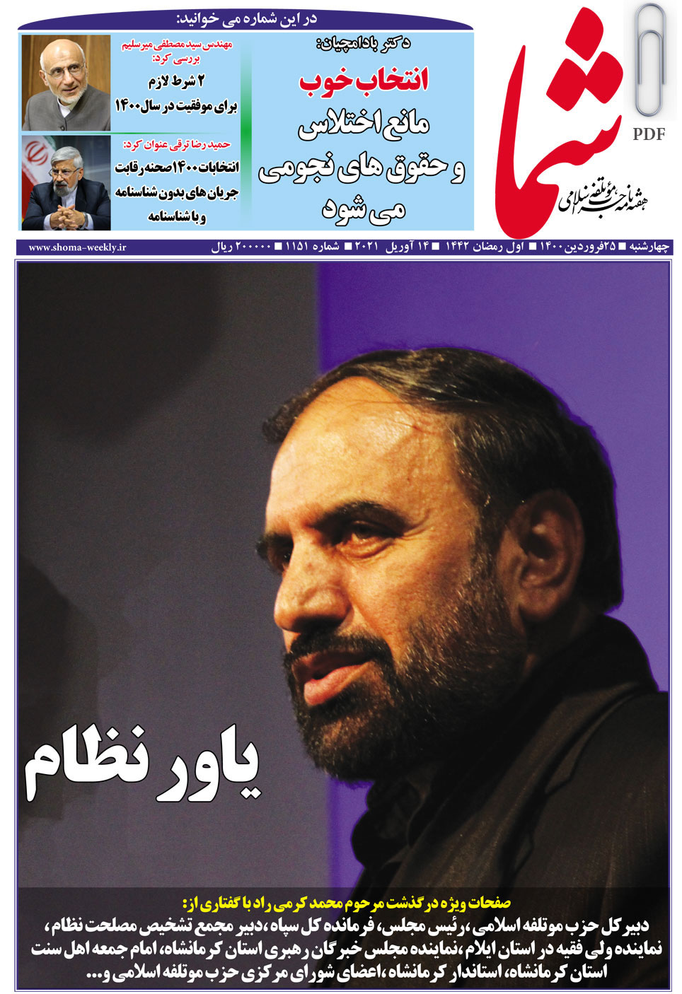 هفته نامه شما در تاریخ 25 فروردین ماه 1400 به شماره 1151منتشر گردید. برای دریافت فایل PDF آن اینجا (+)کلیک کنید.