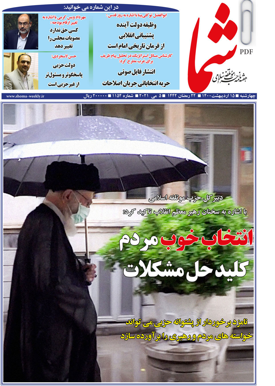 هفته نامه شما در تاریخ 15 اردیبهشت ماه 1400 به شماره 1154 منتشر گردید. برای دریافت فایل PDF آن اینجا
