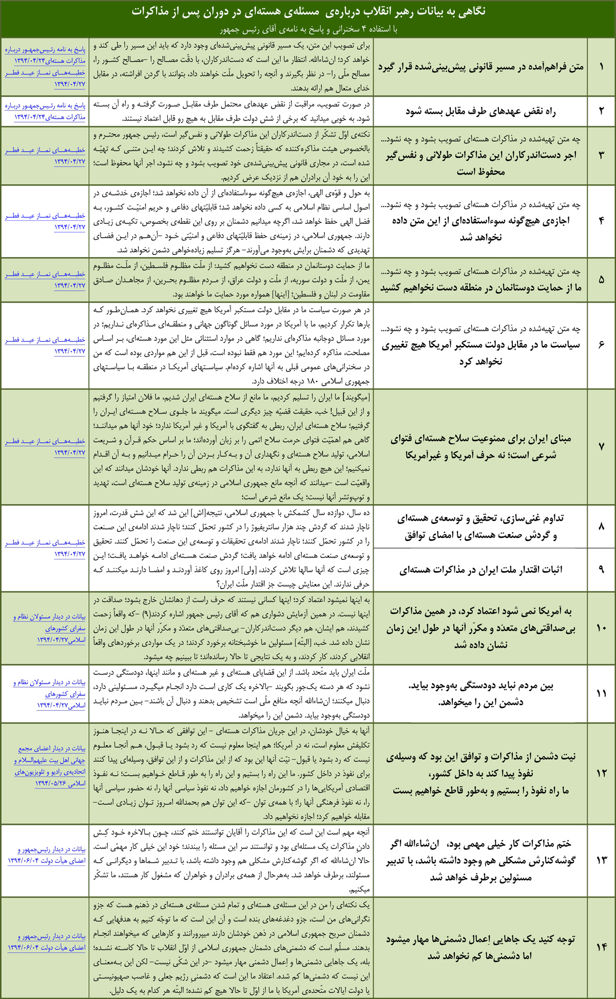 اینها موارد عمده و مهمّی است که روی آن تکیه داریم؛ البتّه خطوط قرمز فقط اینها نیست؛ دوستان مذاکرهکننده در جریان نظرات ما هستند؛ جزئیّات را با آنها در میان گذاشتهایم؛ [البتّه] جزئیّات مورد نظر و آن چیزهایی که بنده وارد میشوم؛ در خیلی از جزئیّات هم ما وارد نمیشویم.