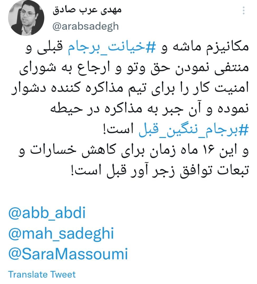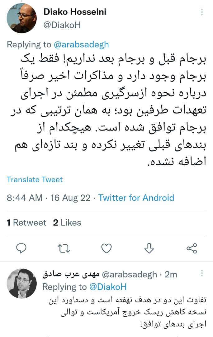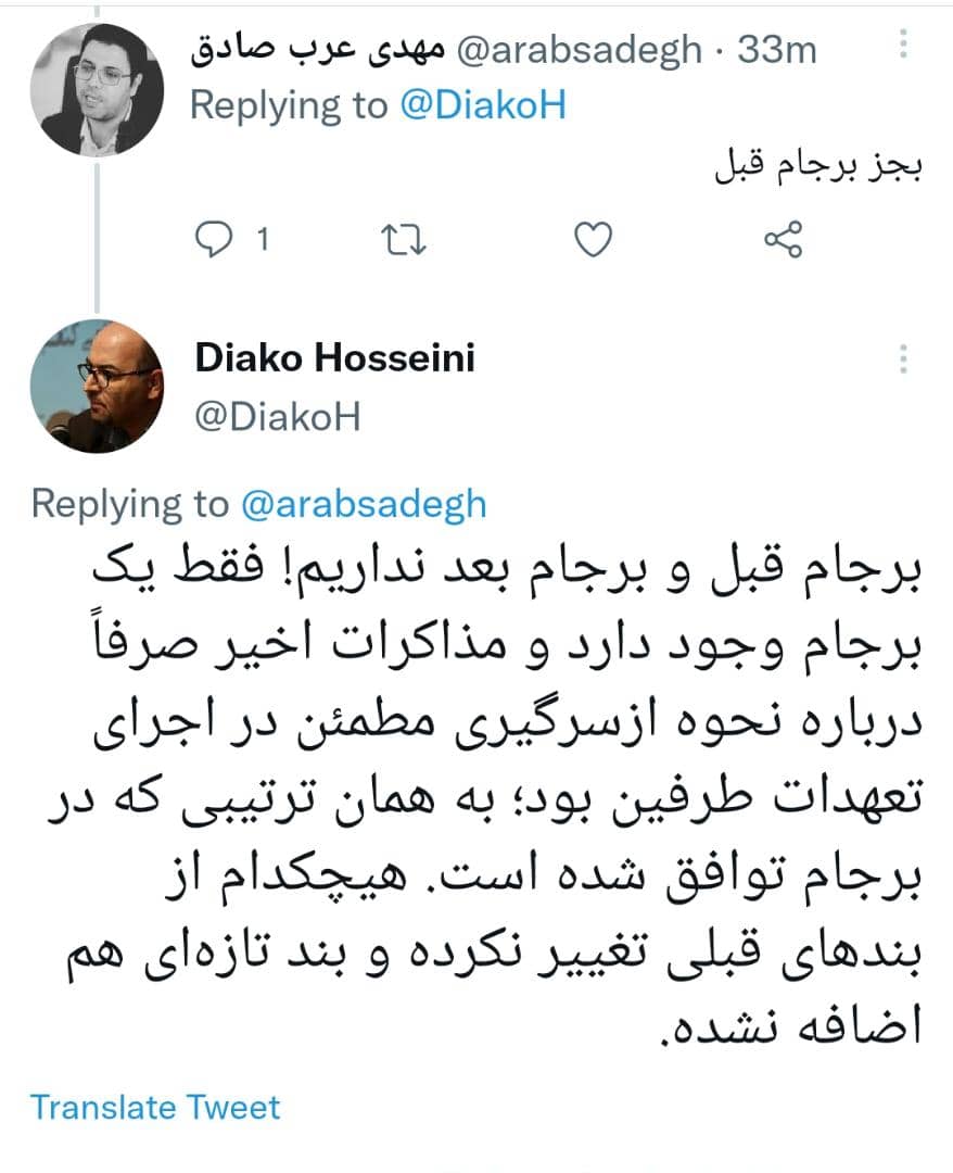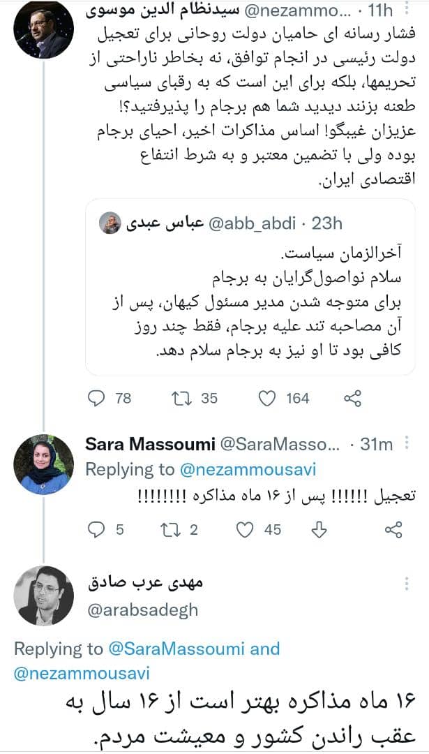 آنچه پیش رو دارید گفتگوی توییتری دکتر مهدی عرب صادق معاون سیاسی حزب موتلفه اسلامی با برخی فعالان سیاسی و نیز واکنش وی نسبت به برخی اظهار نظرها درباره این مذاکرات است؛؛
